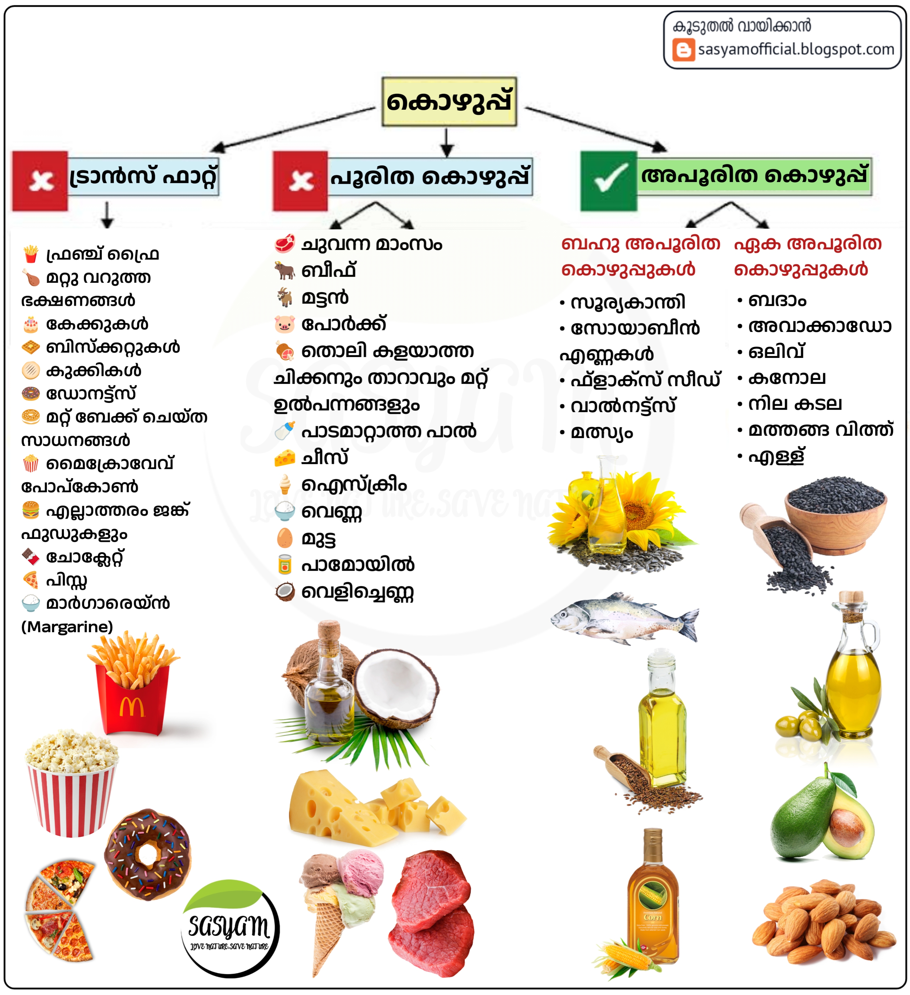 ഭക്ഷണത്തിലെ കൊഴുപ്പുകൾ തമ്മിലുള്ള വ്യത്യാസം അവയുടെ രാസഘടനയിലാണ് എല്ലാ കൊഴുപ്പുകളും നിർമിച്ചിരിക്കുന്നത് കാർബൺ ആറ്റങ്ങളുടെ ഒരു ശൃംഖലയായാണ്. അത് ഹൈഡ്രജൻ ആറ്റങ്ങളുമായി ബന്ധപ്പെട്ടിരിക്കുന്നു. അല്ലെങ്കിൽ ബന്ധിപ്പിച്ചിരിക്കുന്നു. ഇതിന്റെ അടിസ്ഥാനത്തിൽ കൊഴുപ്പിനെ പൊതുവെ മൂന്നായി തരം തിരിക്കുന്നു.